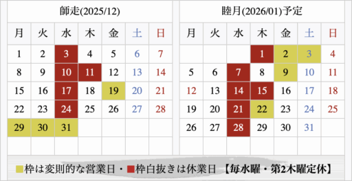 2025/12/01 / 最終更新日時 : 2025/11/27 aruji ■一酒庵*お知らせ 師走のこよみ 12月の一酒庵カレンダーです 03日(水)…定休日 10日(水)〜11日(木)…定休日 17日(水)…定休日 19日(金)…遅始まり 24日(水)…定休日 29日(月)〜30日(火)…早仕舞い 31日(水)…平常営業・早仕舞い \ 最新情報をチェック / FacebookXBlueskyHatenaCopy
