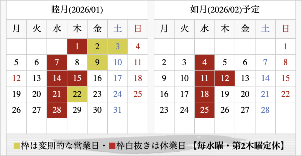 2026/01/01 / 最終更新日時 : 2025/12/27 aruji ■一酒庵*お知らせ 睦月のこよみ 01月の一酒庵カレンダーです ※木曜の定休日が一週間ずれます 01日(木・祝)…臨時休業 02日(金)〜03日(土)…17時早仕舞い 07日(水)…定休日 09日(金)…午前中休み 14日(水)〜15日(木)…定休日 21日(水)…定休日 22日(木)…11時遅始まり 28日(水)…定休日 \ 最新情報をチェック / FacebookXBlueskyHatenaCopy