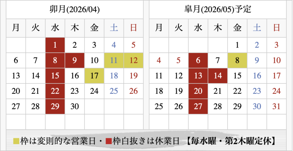 2026/04/01 / 最終更新日時 : 2026/03/28 aruji ■一酒庵*お知らせ 卯月のこよみ 04月の一酒庵カレンダーです 01日(水)…定休日 08日(水)〜09日(木)…定休日 11日(土)〜12(日)…周辺に交通規制あり 15日(水)…定休日 17日(金)…遅始まり 22日(水)…定休日 29日(水・祝)…定休日 \ 最新情報をチェック / FacebookXBlueskyHatenaCopy