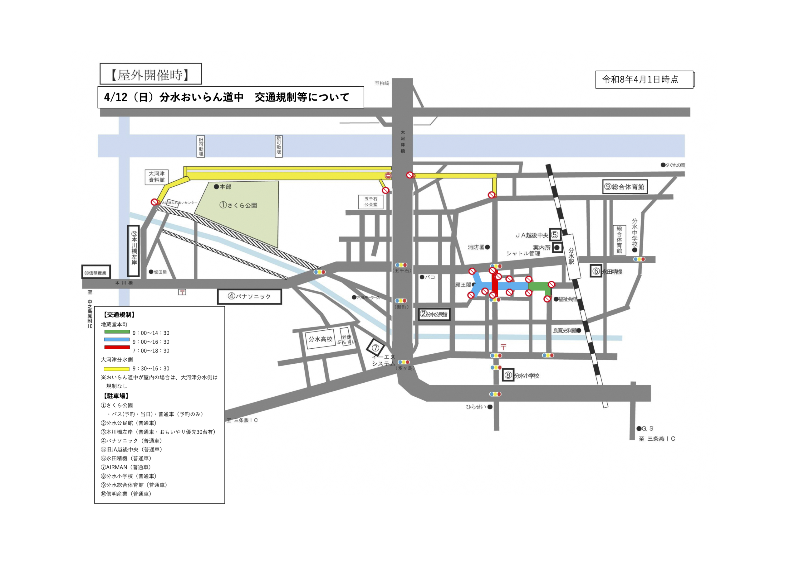 *天候不良時は開催場所が屋内に変わるため、大河津分水側の規制はありません*